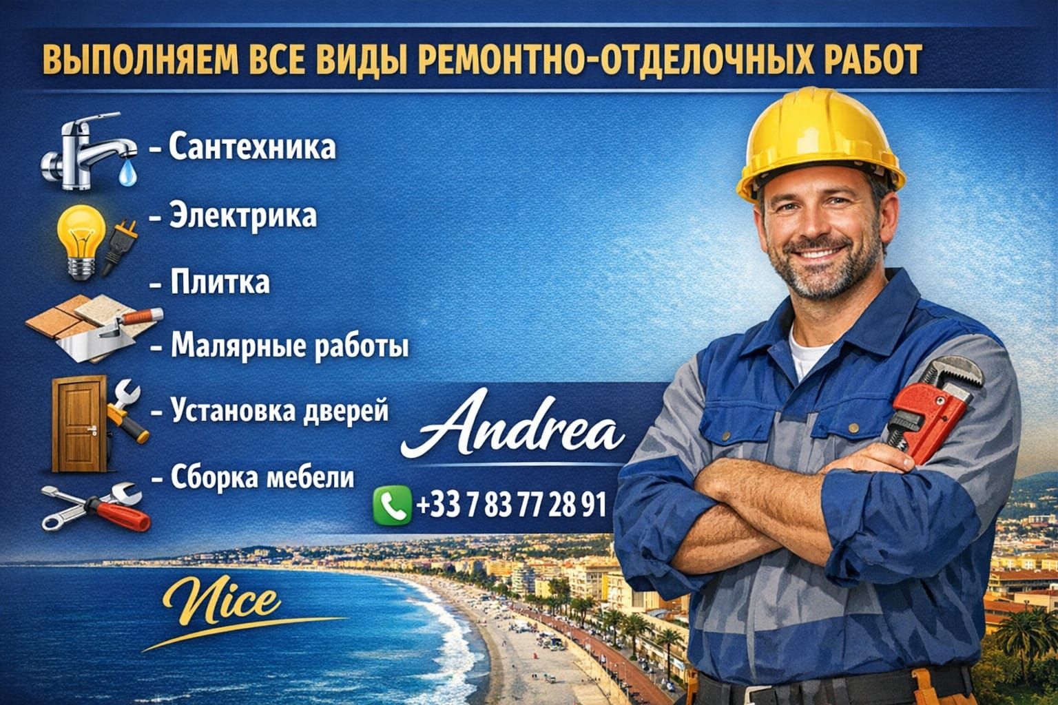 Plumbing - installation, replacement, connection Electricity - wiring, sockets, switches, panels Tile - laying on floors and walls, bathrooms, kitchens Painting works - painting walls, ceilings, decorative coatings Door installation - interior, entrance Furniture assembly - wardrobes, kitchens, any furniture Contacts 📞 André: +33 7 83 77 28 91 📍 Nice and surrounding areas Call or write - we will agree on deadlines and costs.