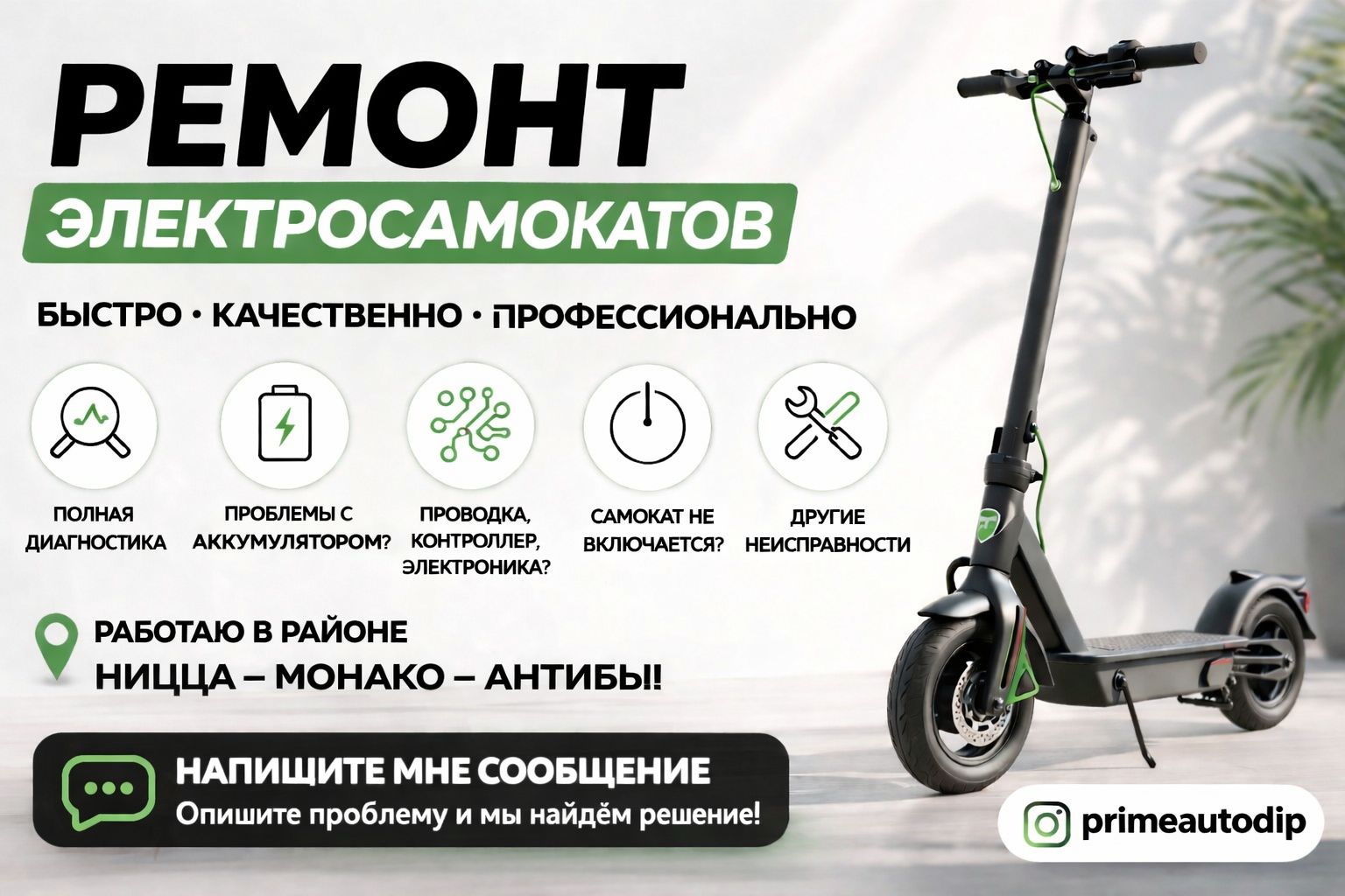 Posso aiutare con i seguenti problemi: • Diagnosi completa. • Il monopattino non si accende? • Problemi con la batteria? • Problemi con il cablaggio? • Problemi con il controller ed elettronica? • Altri guasti. Lavoro con cura, qualità e professionalità. Opero nell'area di Nizza - Monaco - Antibes Scrivimi un messaggio, descrivi dettagliatamente il problema e troveremo una soluzione. Instagram: @primeautodip