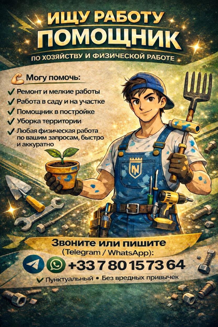 Могу помочь: ✅ Ремонт и мелкие работы — выполню небольшие ремонтные задачи по дому ✅ Работа в саду и на участке — уход за растениями, стрижка газона, уборка территории ✅ Помощник в постройке — подсобные работы на строительных объектах ✅ Уборка территории — наведение порядка на участке, вывоз мусора ✅ Любая физическая работа — быстро и аккуратно, под ваши запросы О себе 🔹 Пунктуальный 🔹 Без вредных привычек 🔹 Ответственно подхожу к выполнению задач Контакты 📲 Telegram / WhatsApp: +33 7 80 15 73 64 Звоните или пишите — договоримся о времени и объеме работ.