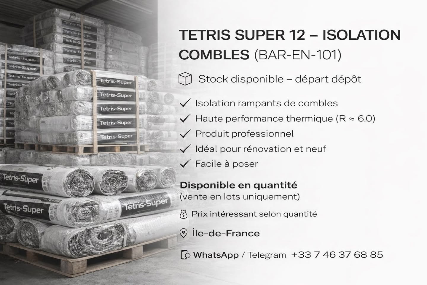 📦 Сток в наличии – отгрузка со склада Характеристики ✔️ Утепление скатных кровель и чердаков ✔️ Высокая тепловая эффективность (R ≈ 6.0) ✔️ Профессиональный материал ✔️ Идеально для реновации и нового строительства ✔️ Легкий монтаж Условия продажи 📦 Доступно в количестве 📌 Продажа только партиями (оптом) 💰 Цена зависит от объема – выгодные условия 📍 Местоположение: Иль-де-Франс (Île-de-France) Контакты 📲 WhatsApp / Telegram: +33 7 46 37 68 85